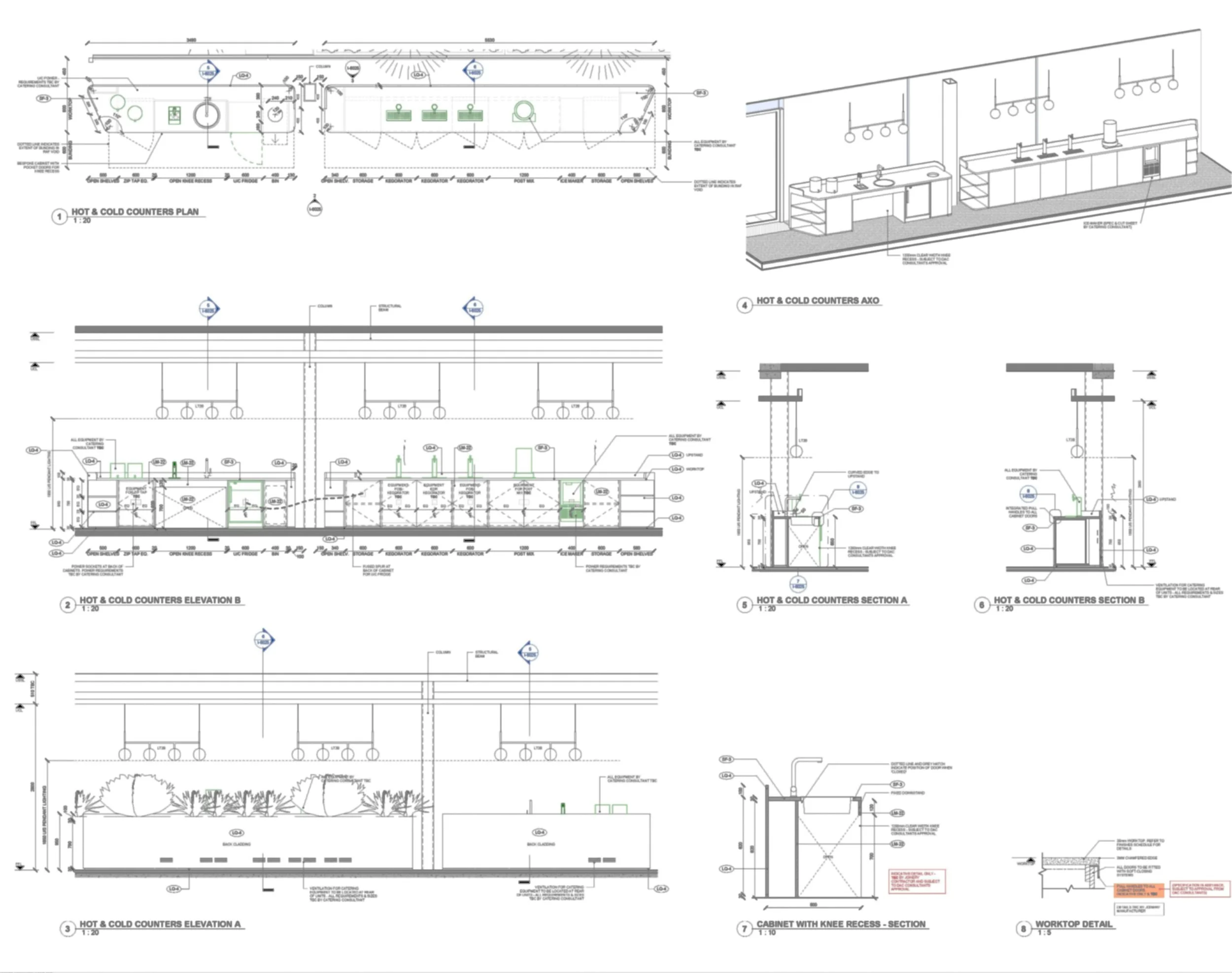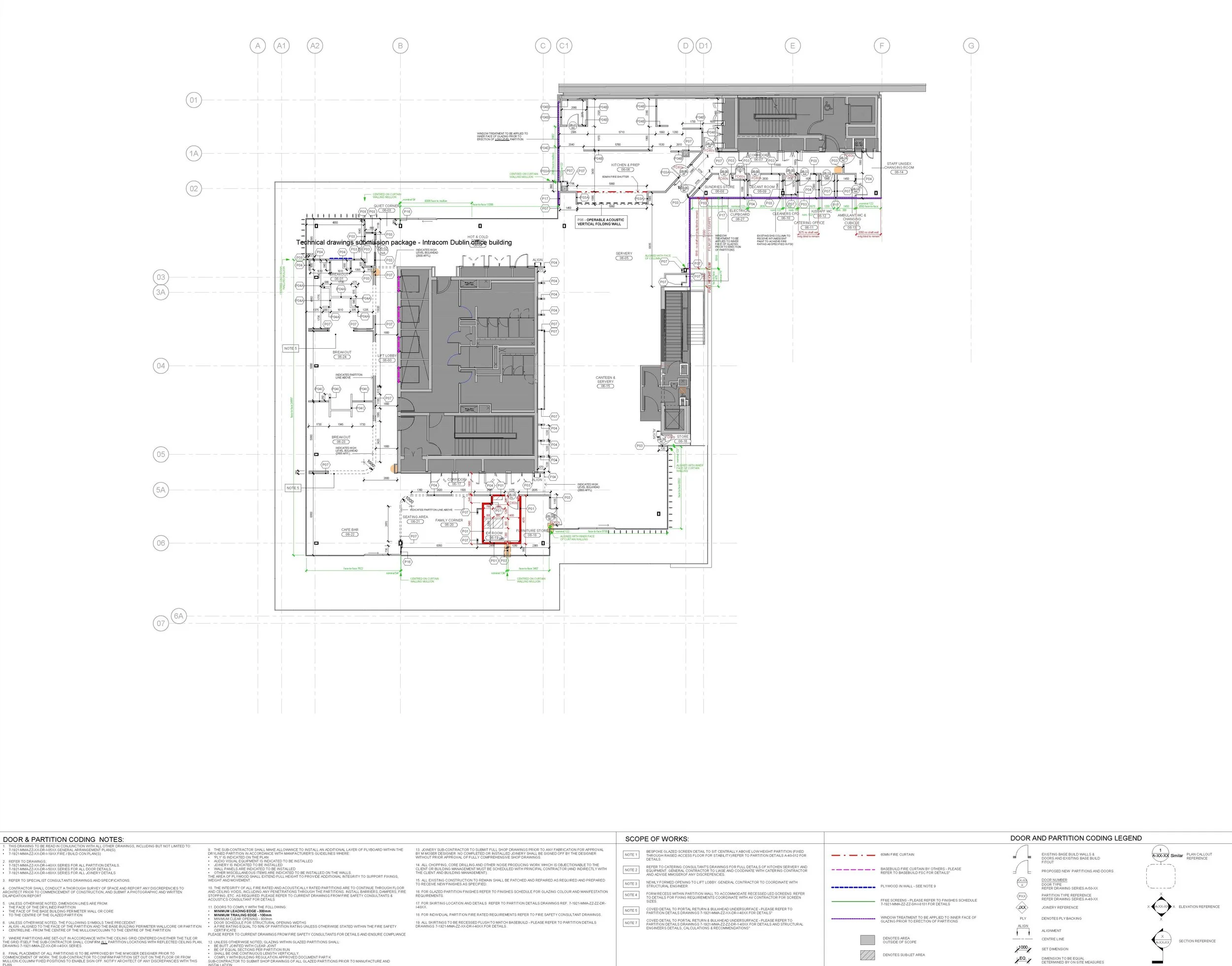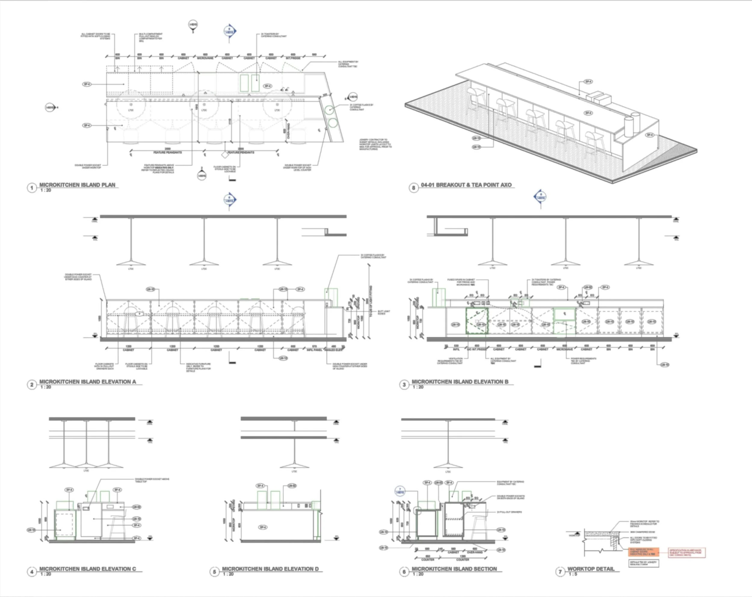 Pre-construction joinery drawing details for Intercom office space including Reception Café, Reception Desk, Micro kitchen Island, Hot & Cold Counters and Kitchen Serveries. As part of the submission package, Floor Finishes Plan, Door & Partition and Furniture Coding Plans are included with the relevant schedules.