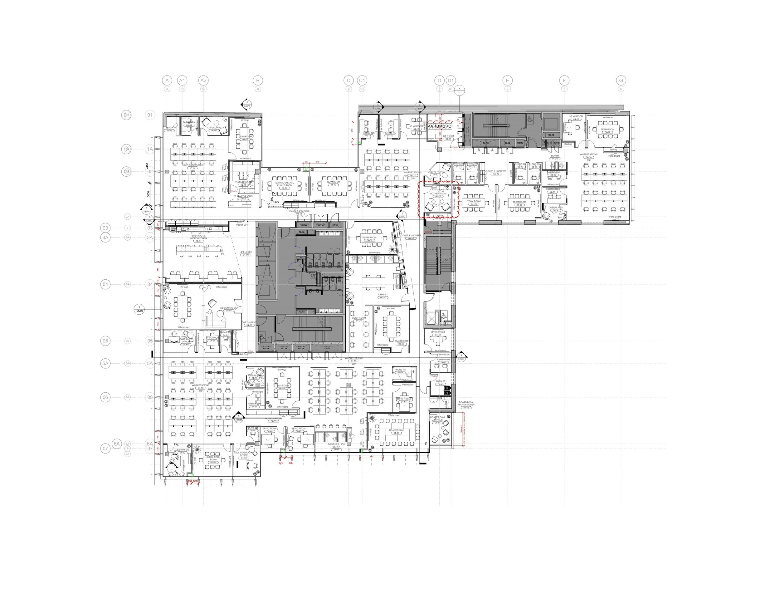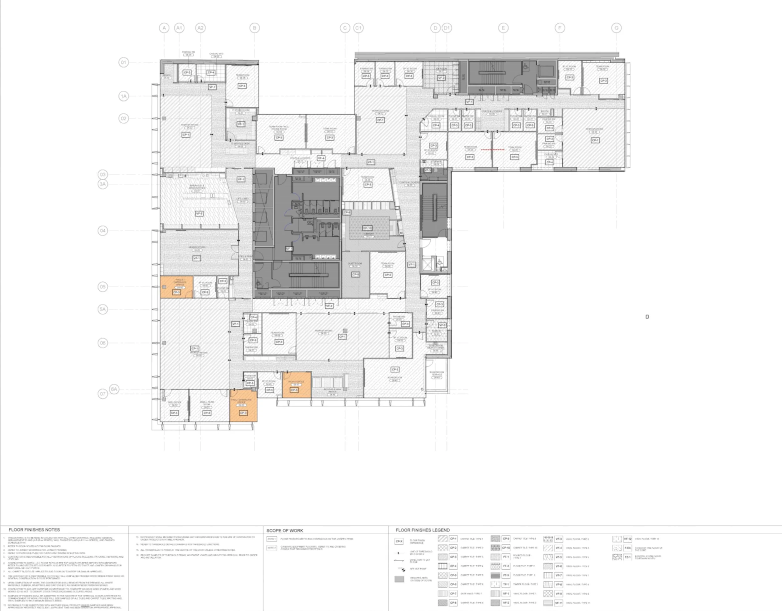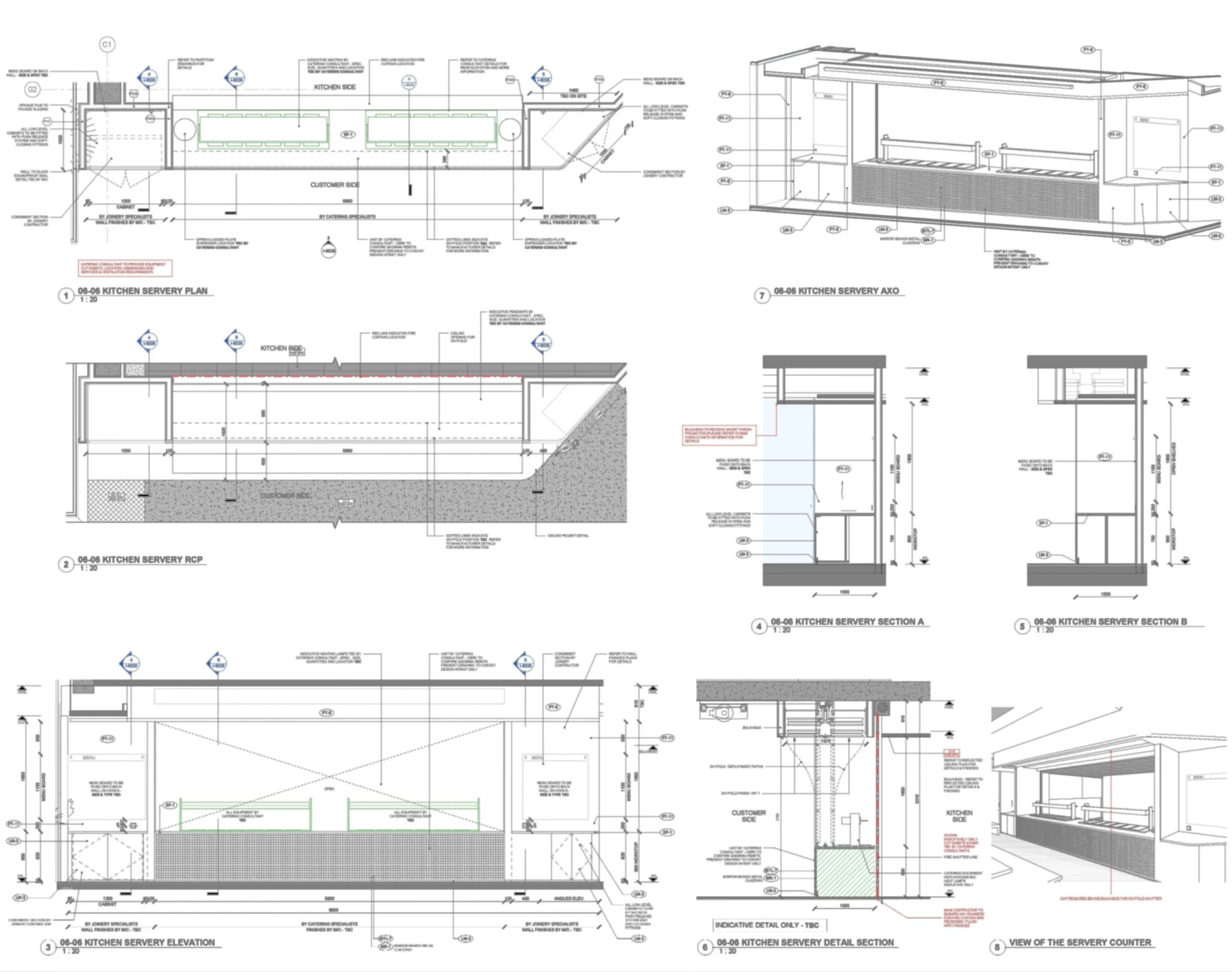 Pre-construction joinery drawing details for Intercom office space including Reception Café, Reception Desk, Micro kitchen Island, Hot & Cold Counters and Kitchen Serveries. As part of the submission package, Floor Finishes Plan, Door & Partition and Furniture Coding Plans are included with the relevant schedules.